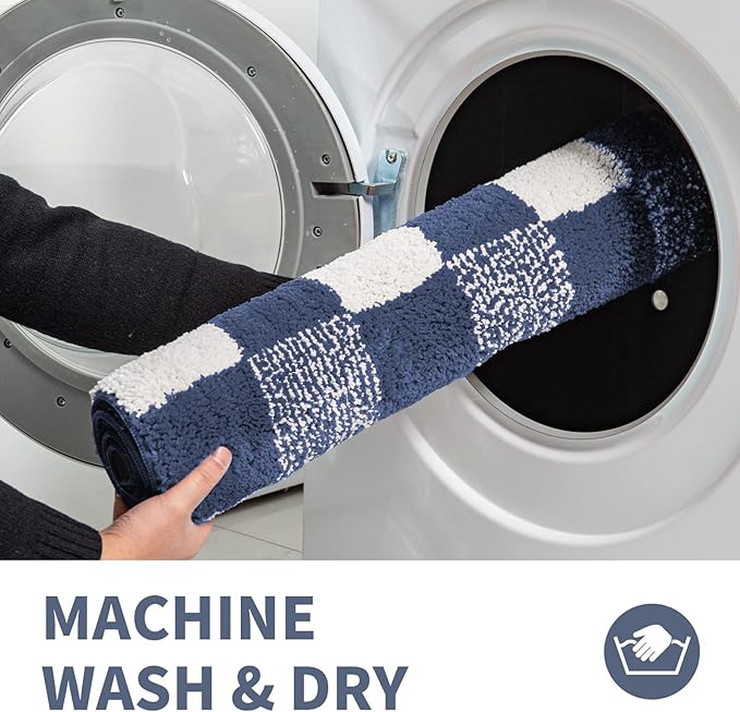 CozeCube Blue Checkered Bath mats for Bathroom Non Slip, Fluffy Absorbent Microfiber Bath mat Washable, Aesthetic Bathroom Rugs, Large Bath mat for Sink, 36" x 24"