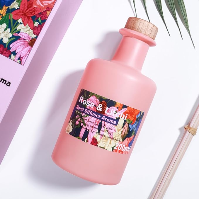 Reed Diffuser Set - Rose & Litchi Essential Oil, 6.8fl oz/200ml Sweet Floral Aroma Scented Oil, Large Capacity Color Bottle, Home Aromatherapy for Bedroom Bathroom Office Shelf Decor
