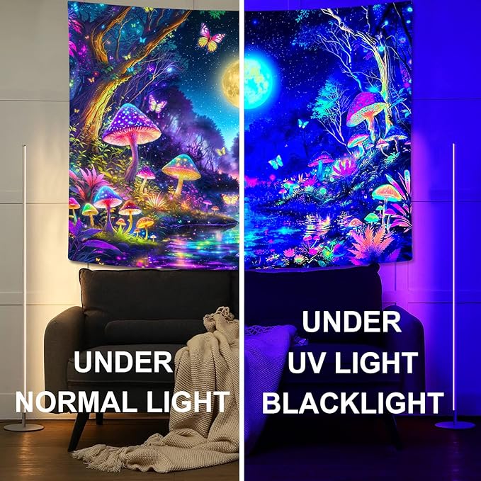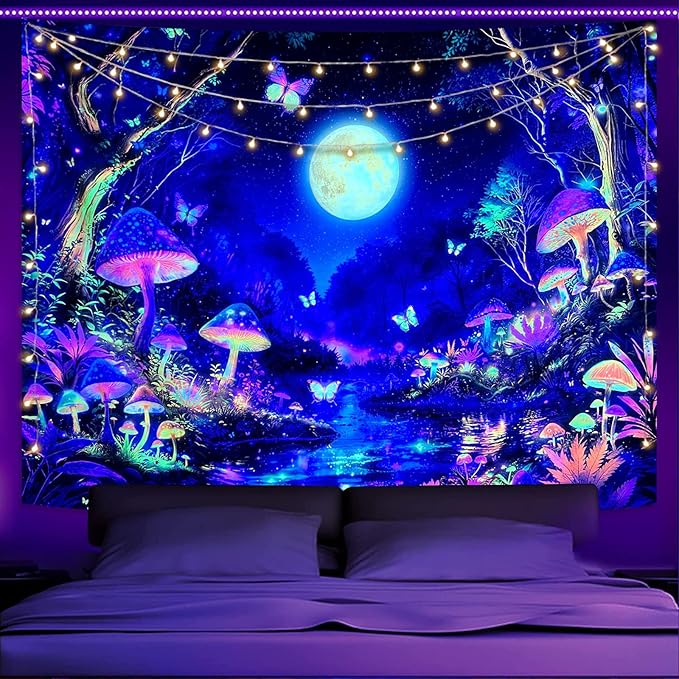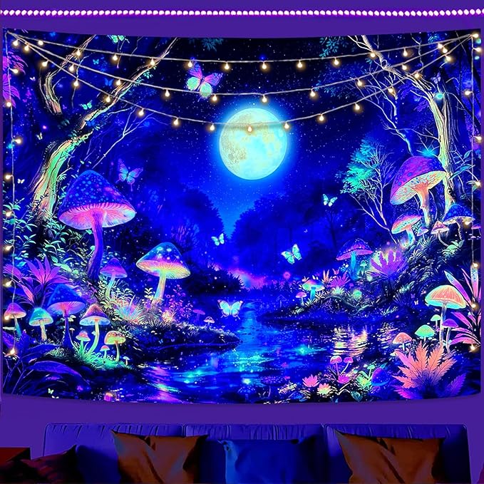 Kanuyee Blacklight Tapestry Butterfly Moon Wall Tapestry Magical Forest tapestries for Bedroom Magical tapestries Aesthetic Bedroom Room Decor Moon 70×90 Inches