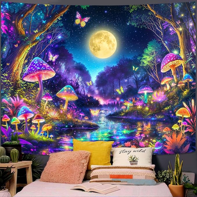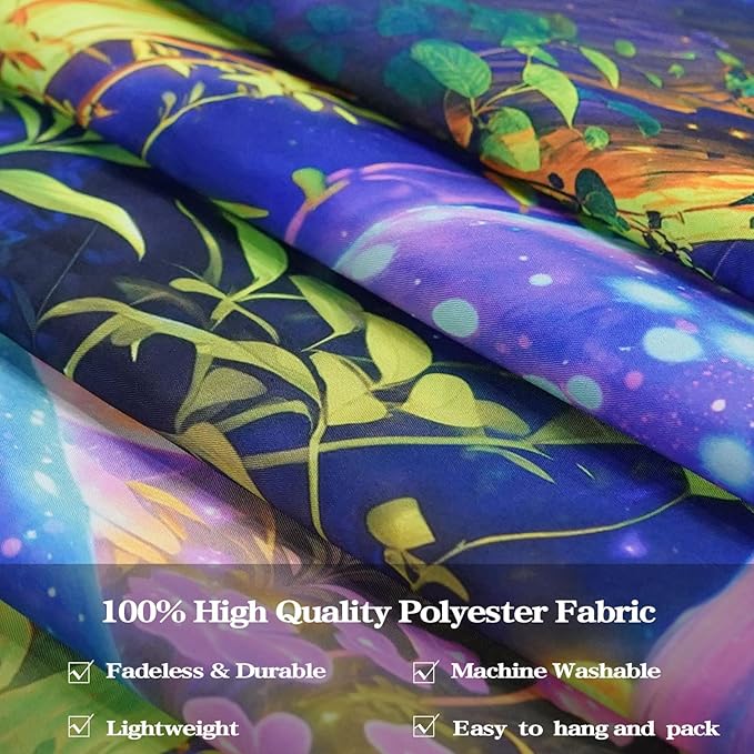 - Magical Enchanted Forest Design: This tapestry showcases a dreamy, mystical forest scene with glowing mushrooms, cascading waterfalls, and a colorful rainbow. It creates a fairyland-like atmosphere, adding whimsy and wonder to any room.