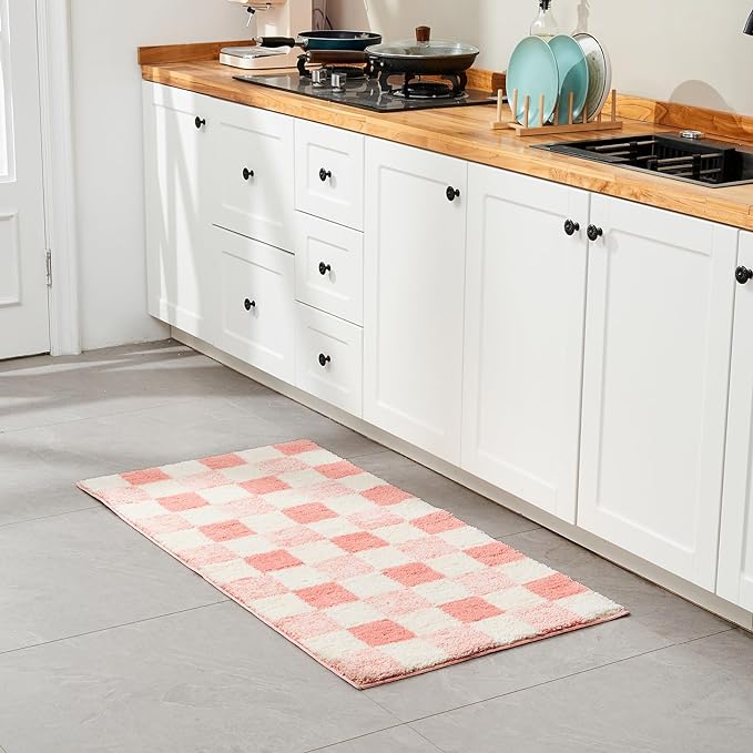 CozeCube Pink Checkered Bath mats Non Slip, Fluffy Absorbent Microfiber Runner Bath mat Washable, Aesthetic Bathroom Rugs, Long Bath mat for Bathroom Floor, 47"X24"