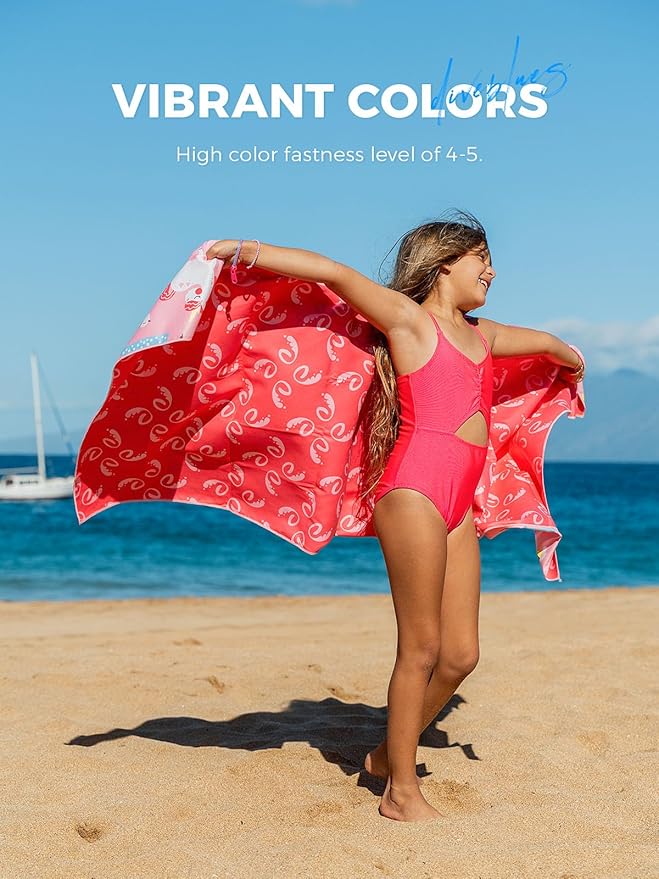 - ?ŒŠKid-Friendly & Colorful: Thanks to digital printing, colors stay vivid wash after wash. Your kids will love our signature double-sided prints and have twice the fun with them. High color fastness level of 4-5. Everyone needs a cute towel, especially kids. They can take their favorite towel to swimming, the beach, camping, hiking, picnics, pool parties, sleepovers, on vacation, and road trips.(Note: Wash before first use for increased softness.ï¼?/li>
