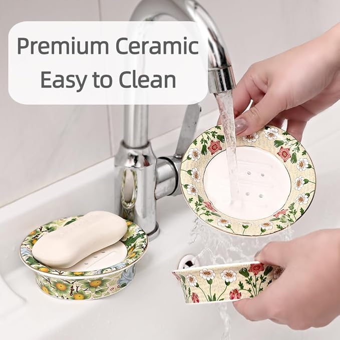 Floral Decorative Self Draining Soap Dish, Double-Layer Round Soap Tray, Vintage Ceramic Soap Dish (Style A)