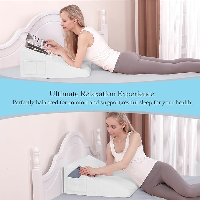 - 【STORAGE POCKET& PORTABLE HANDLE】: This pillow wedge has two side pockets with different orientations that can store your phone, glasses, and remote control.Portable handle for easy transport.The non-slip fabric at the bottom ensures the pillow stays in place for a peaceful sleep.