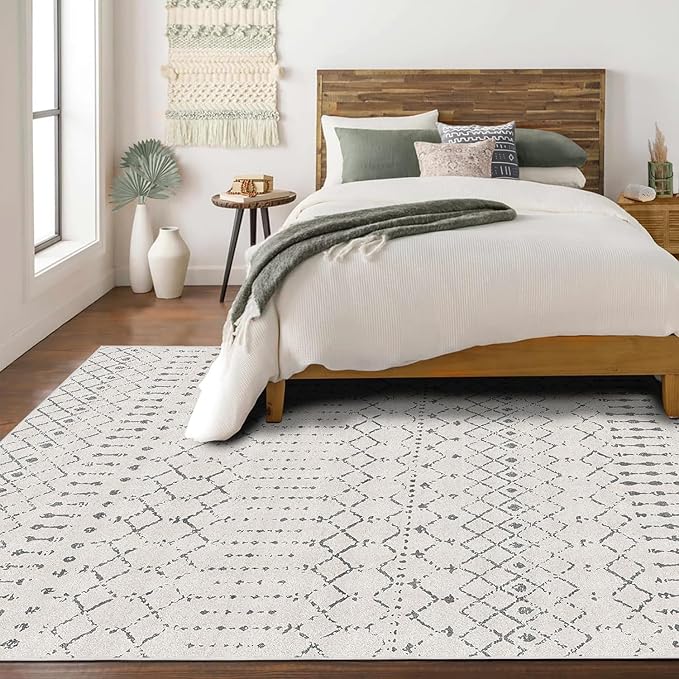 Deerly 5x7 Area Rugs for Living Room, Washable Rugs Moroccan Boho Farmhouse Rug with Non-Slip Backing, Soft Low Pile Indoor Floor Carpet Neutral Rug for Bedroom Dining Room, Off White/Grey