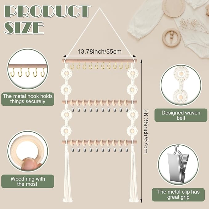 - Beautiful Design: its pleasing beige color and elegant style make this pacifier clip holder a beautiful addition to different rooms, integrating seamlessly with many decoration styles; With a size of approximately 26.38 x 13.78 inches/ 67 x 35 cm, our holder is of a compact size that fits well in many spaces while providing an adequate organizing solution; Its lightweight design and easy assembly materials make installation an easy task