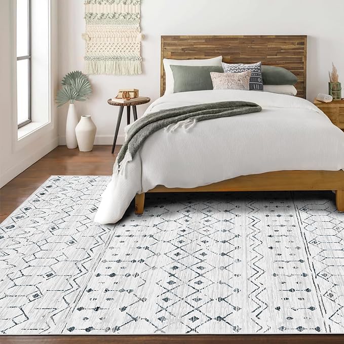 Deerly 6x9 Rug Bedroom Distressed Area Rugs, Non Slip Moroccan Boho Farmhouse Washable Rugs for Living Room Home Office Decor, Soft Low Pile Indoor Floor Carpet Area Rug, White/Dark Grey