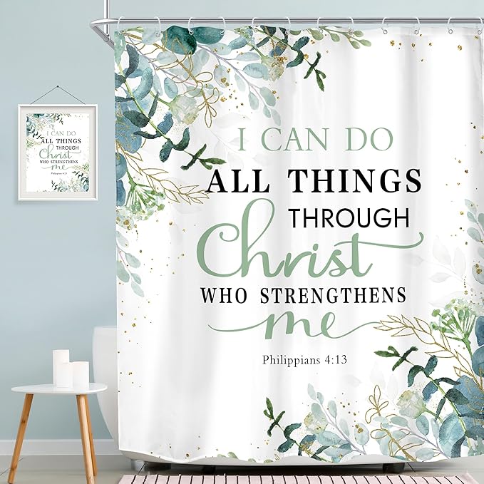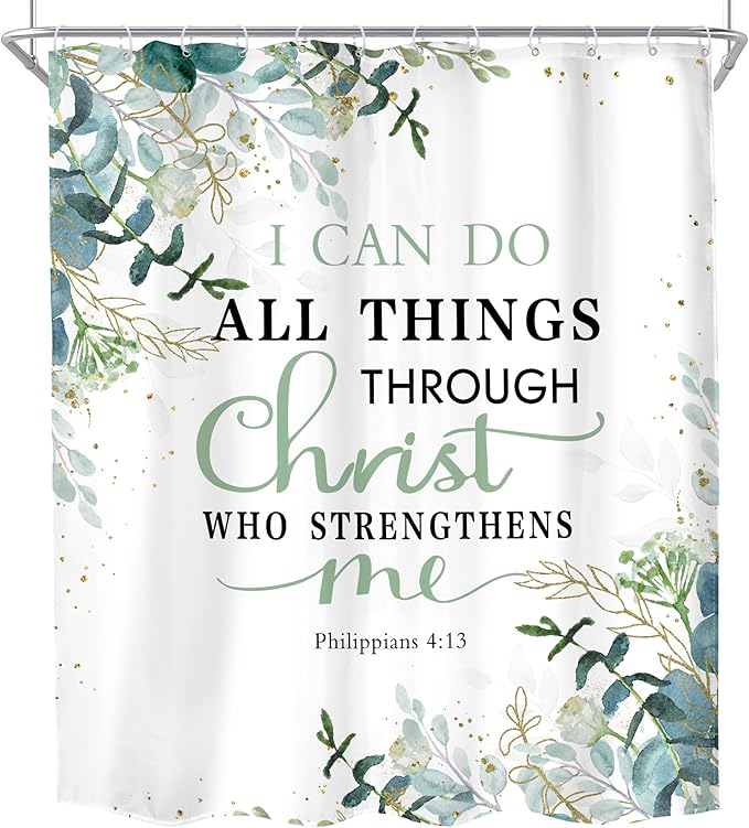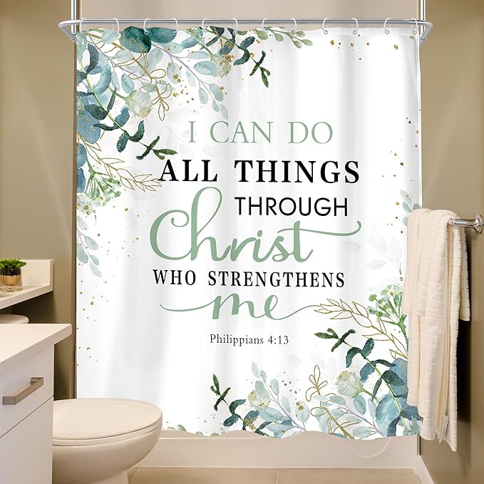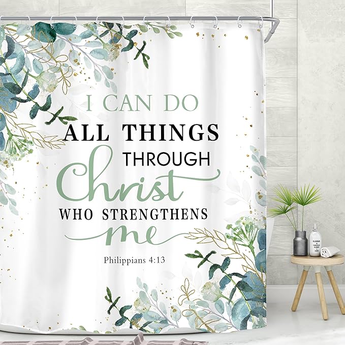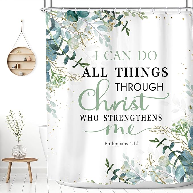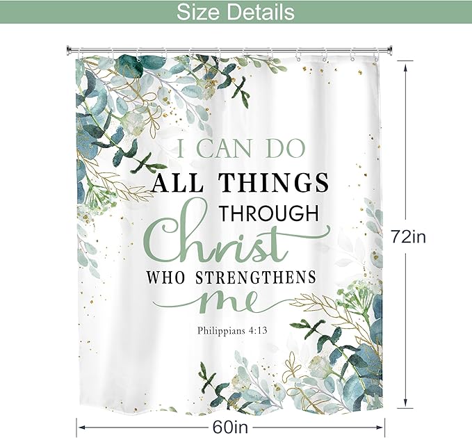 MESHELLY Green Christian Shower Curtain 60Wx72H Inspirational Shower Curtain Rustic Eucalyptus Bible Verses Quotes Bathroom Curtain for Women Scriptures Leaves Bathroom Decor Fabric with 12 Hooks