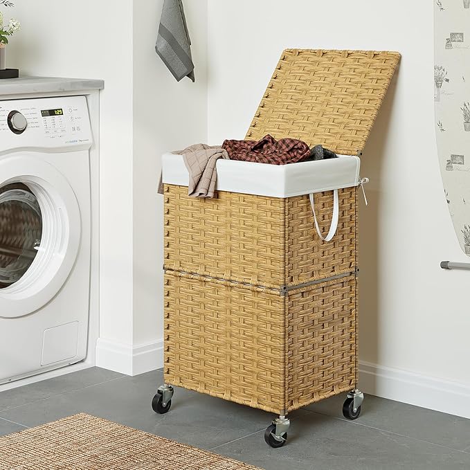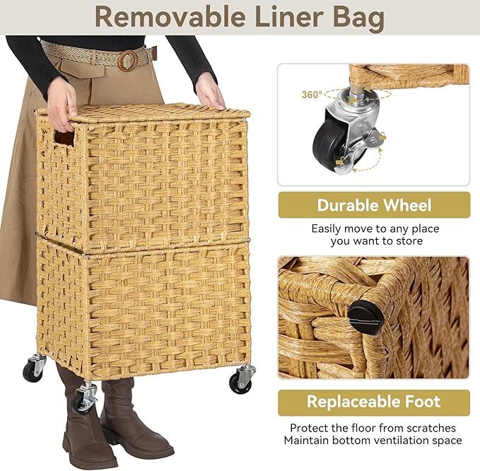 Chrislley 90L Slim Laundry Hamper with Wheels,Rolling Laundry Basket with Lid and Renovable Liner Bag,Handwoven Rattan Organizer for bedroom, bathroom, laundry room (Yellow)