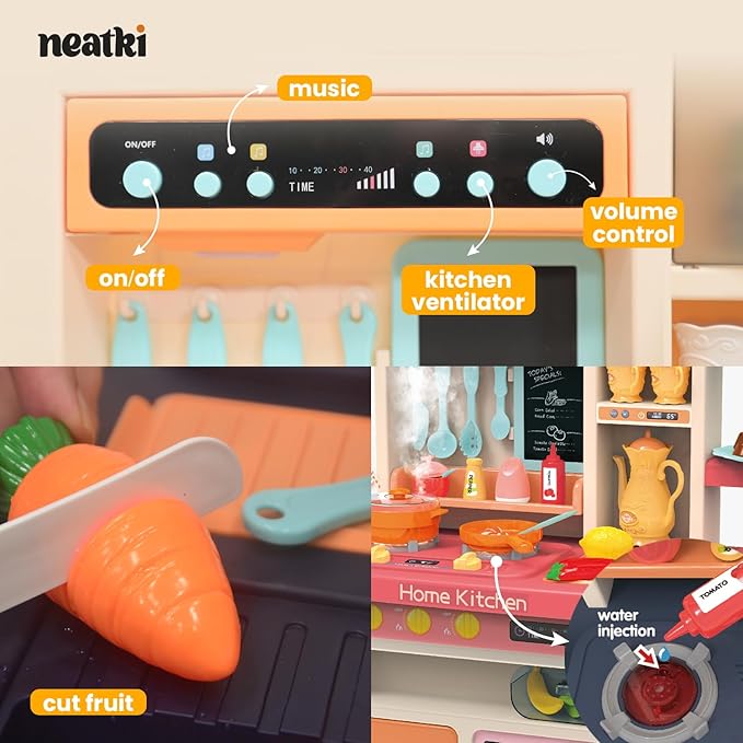 - Steaming Action – Mimicking real cooking experiences, this play kitchen set includes steaming action, adding a touch of realism to pretend cooking activities, encouraging creative storytelling and problem-solving.