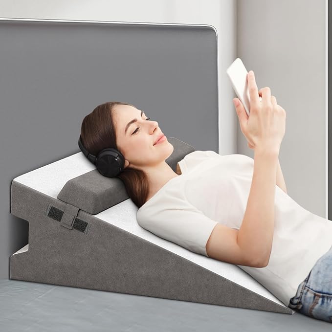 - [Ergonomic Design] The Wedge pillow combined with ergonomic design adopts two layers of pillows to help correct the upper or lower body. The pillow includes 2.8 inches adjustable soft foam pillow and 7.5 inches high-density memory foam to improve comfort and to ensure pressure relief and neck and back pain, providing you with enough support to improve your quality of sleep.