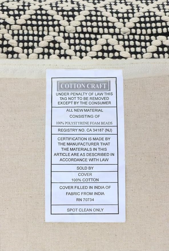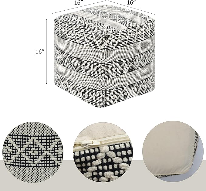 - INCLUDES: One (1) filled 16 inches by 16 inches by 16 inches Cotton Square Pouf Ottoman. Filled with dense polystyrene beads (EPS balls) to retain structure and shape. Color - Ivory Black