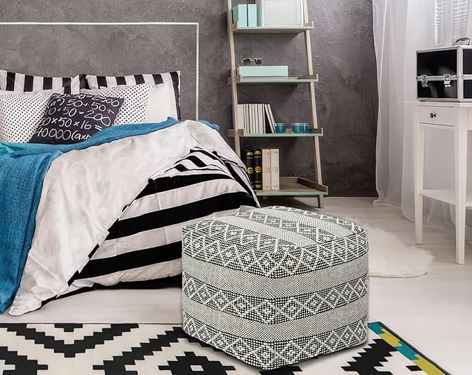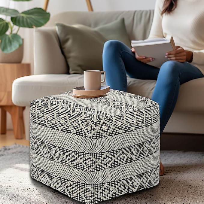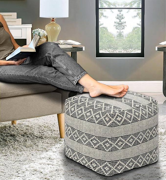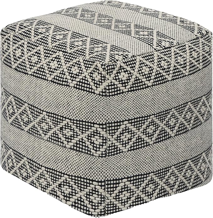 COTTON CRAFT Woven Dhurrie Pouf - Stripe Diamond Pattern Ottoman Footstool Bean Bag - Dorm Bedroom Small Spaces Accent Seating - Prefilled Comfortable Square Pouf Footrest - 16x16 - Ivory Black