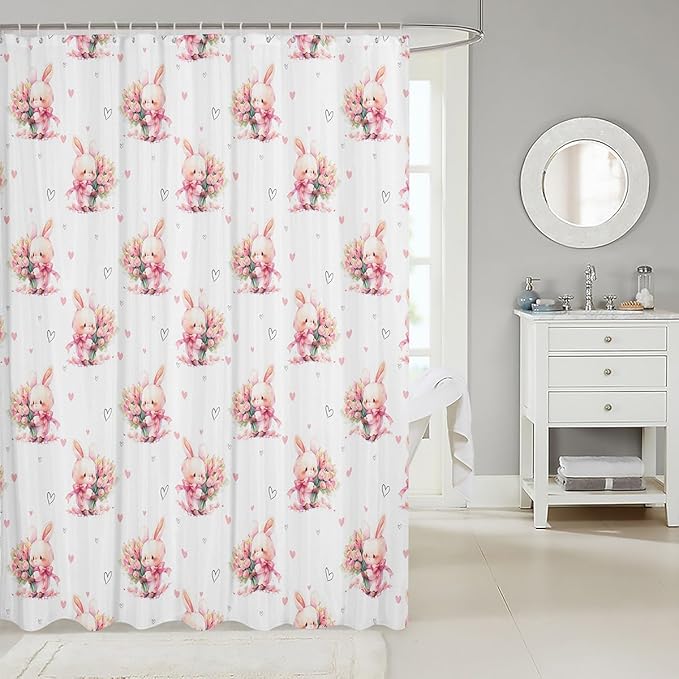 Cute Rabbits Kids Shower Curtains,Tulip Flowers Love Heart Romantic Bathroom Curtains for Girls Boys,Happy Easter Cartoon Animals Pink Kawaii Waterproof Curtains,12 Hooks Suits,72" W x 72" L
