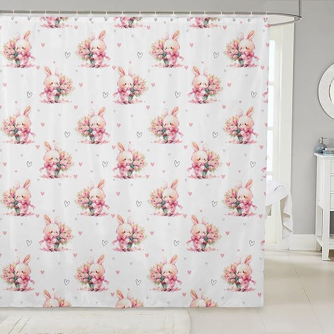 Cute Rabbits Kids Shower Curtains,Tulip Flowers Love Heart Romantic Bathroom Curtains for Girls Boys,Happy Easter Cartoon Animals Pink Kawaii Waterproof Curtains,12 Hooks Suits,72" W x 84" L