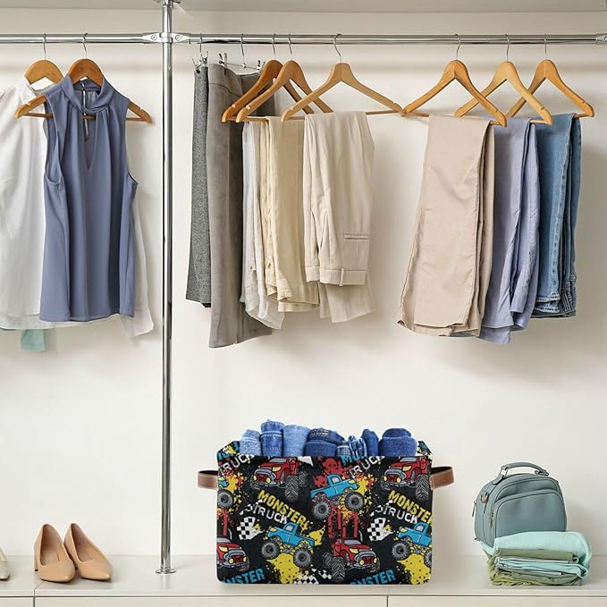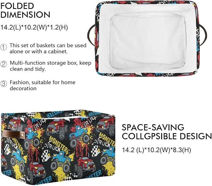 Monster Truck Black Red Blue Storage Basket Fabric Toy Baskets Racing Cars Boys Open Home Storage Bins Boxes Foldable Organizer Bag for Toy Book Shelf Closet Baskets 16×12×8 Inches