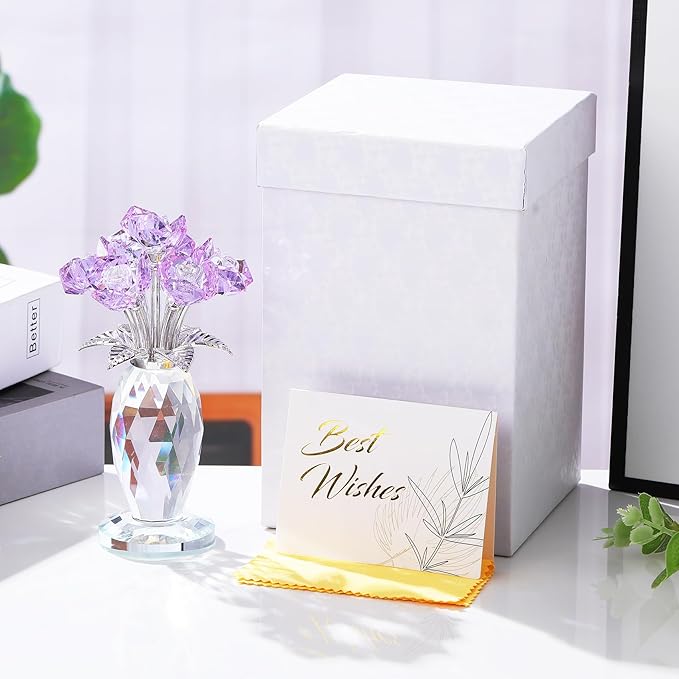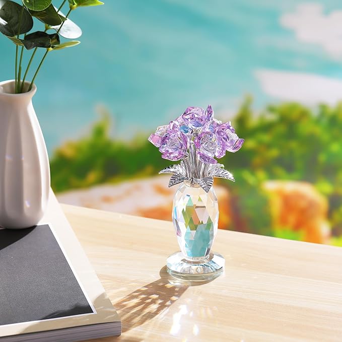 - 💐Crystal Purple Rose Figurine - Our Crystal Rose Bouquet is made of high-quality K9 crystals, clear and glittering. It consists of 7 blossoming roses, sliver stems, and faceted crystal pillars. Delicate and lovely. Size about: 7.5x14.5cm/2.9x5.7in