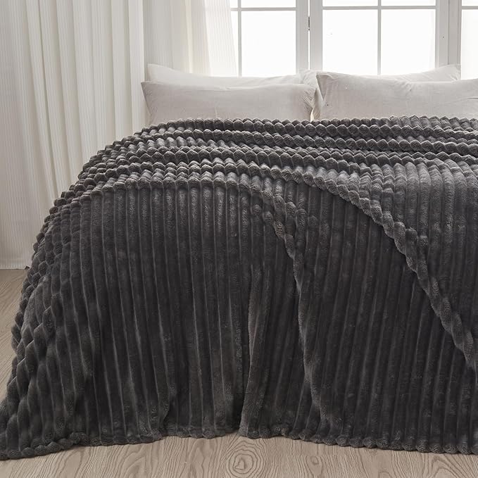 NEWCOSPLAY Super Soft Queen Blanket Grey Premium Silky Flannel Fleece 3D Ribbed Jacquard Lightweight Bed Blanket All Season Use (Grey Ribbed, Queen(90"x90"))