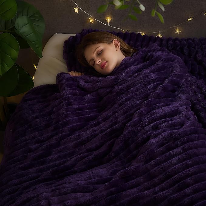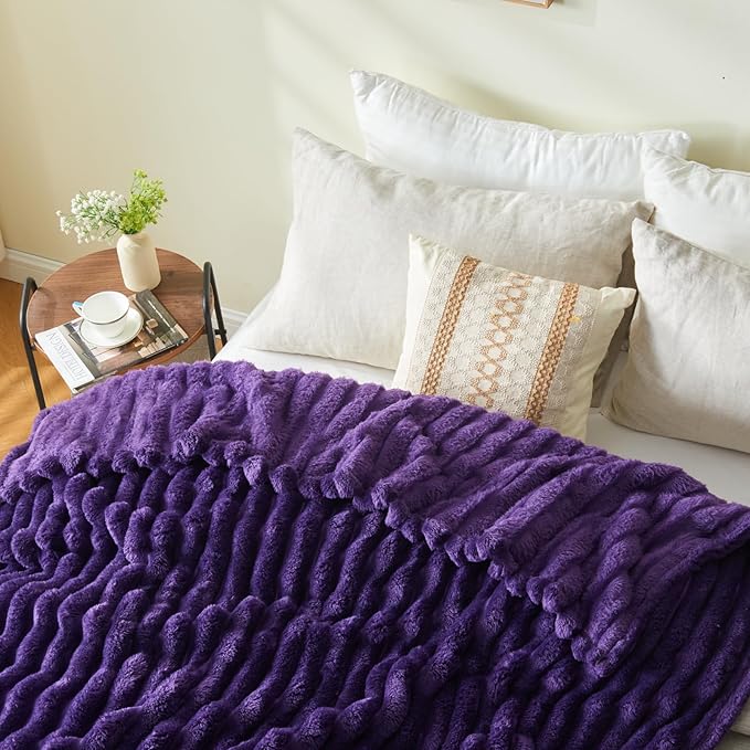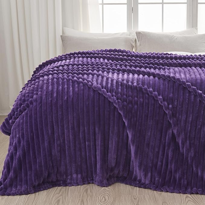 NEWCOSPLAY Super Soft King Blanket Purple Premium Silky Flannel Fleece 3D Ribbed Jacquard Lightweight Bed Blanket All Season Use (Purple Ribbed, King(90"x110"))