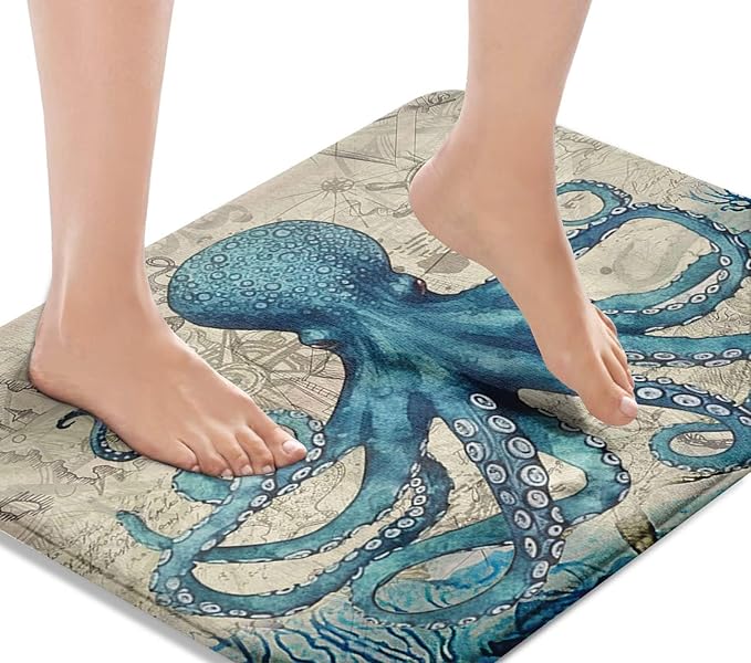 Britimes Blue Bath Mat for Bathroom, Sea Theme Octopus Washable Cover Floor Rug Carpets Floor Mat Bathroom Decorations 20x32 Inches for Kitchen Bedroom Indoor