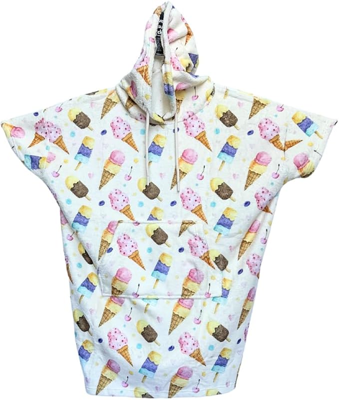 Cotton/Microfiber Kids Surf Poncho, Wetsuit Changing Towel Bath Robe with Hood and Pocket for Ages 3-7 and 8-12 (Ice Creams, 8-12 Years)