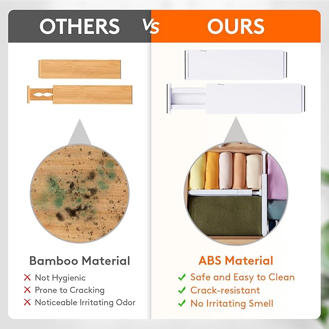 - Advanced Design: Our drawer organizer for clothing is made from stable ABS material and has high-quality EVA foam sponges at the ends to prevent scratches and damage to drawer walls, leaving no trace or residue. Additionally, our divider is patented (Patent No: US12133593B2) for a unique experience.
