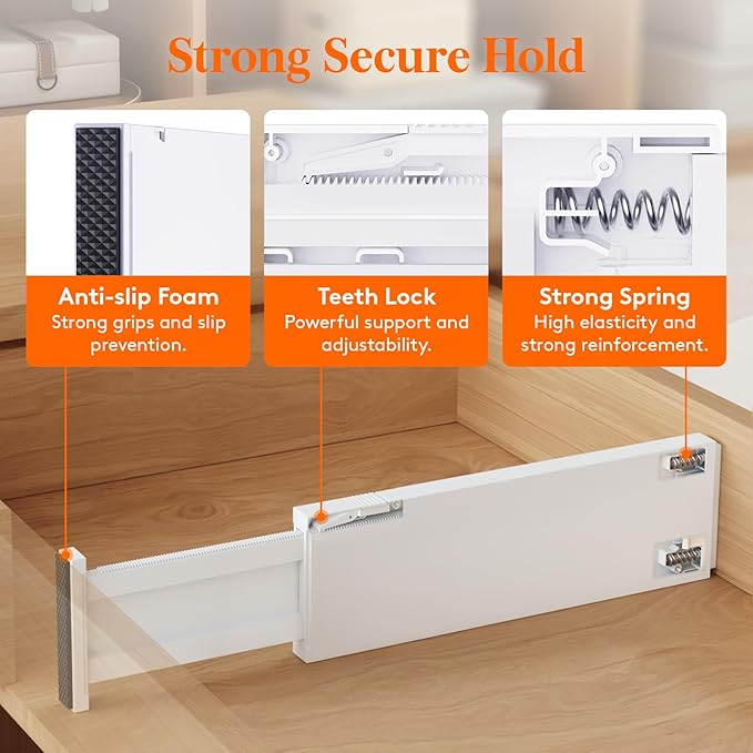 - Stable Installation: Simply press the top button to adjust the length before placing it. After placing, secure it tightly by stretching it out again. The strong spring tension ensures that each dresser organizer stays securely upright. To retract, press the button and push in the stretched side.