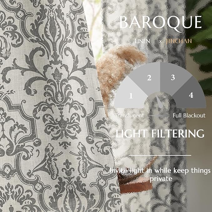 - READY MADE: These linen blend curtains adds some vintage accents to your room. Set includes 2 panels in 52 inch wide by 108 inch long each, 104 by 108 combined. Decor your space with the baroque look and feel of JINCHAN curtains