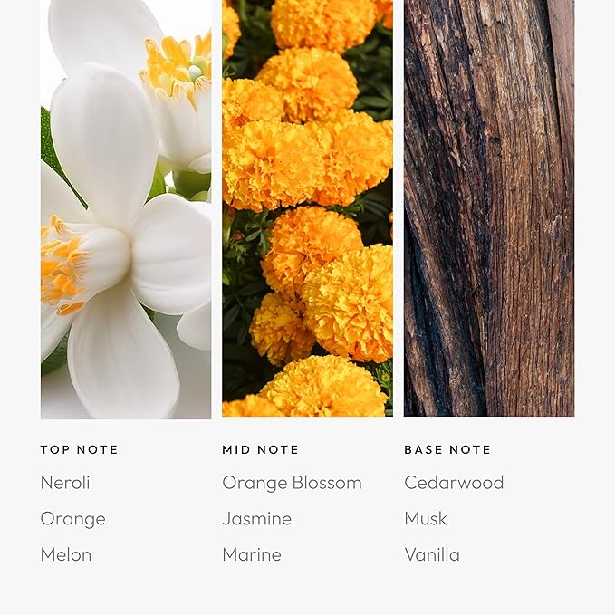 - Experience an opulent fragrance journey with our luxurious blend of orange blossom, green melon, and neroli, culminating in a captivating jasmine and marine heart, followed by a warm embrace of cedarwood, vanilla, and musk.