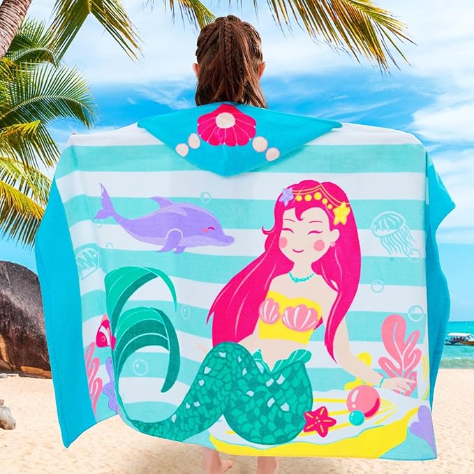 - STRIPE MERMAID BEACH TOWELS : This Hooded COTTON towel wraps adopts an environmentally friendly Printing, the striped mermaid make kids towel so gorgeous and attractive that can get children?s love at once! The beautiful mermaid pattern looks very delicate, absolutely make your little angel stands out from beach or pool