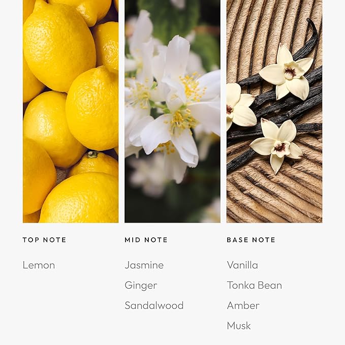 - Experience a captivating fragrance journey with our Lemon-infused top note leading into a harmonious blend of Jasmine, Ginger, and Sandalwood. Finally, indulge in the comforting embrace of Vanilla, Tonka Bean, Amber, and Musk for a truly irresistible aroma.