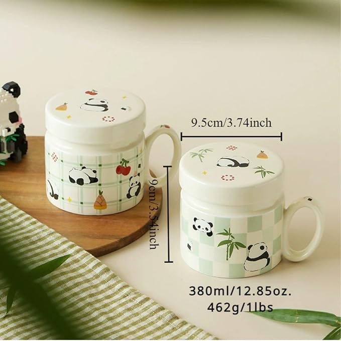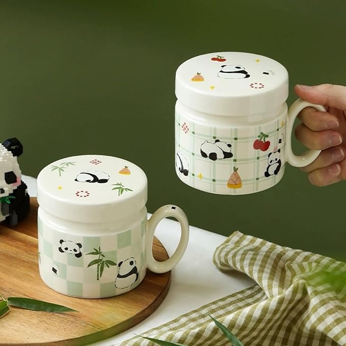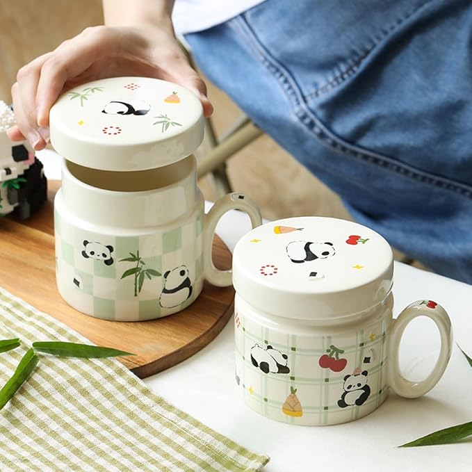 - Adorable Cartoon Panda Design: Both the outer wall of the mug and the lid feature cute cartoon panda design, adding a playful touch. The delightful illustrations depict pandas in a lively and happy scene, creating a refreshing and natural atmosphere with a cream white and spring green check pattern. The cute and vivid illustrations make this mug a standout piece in any home, charming and eye-catching.