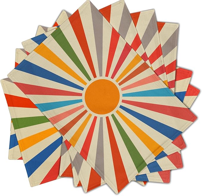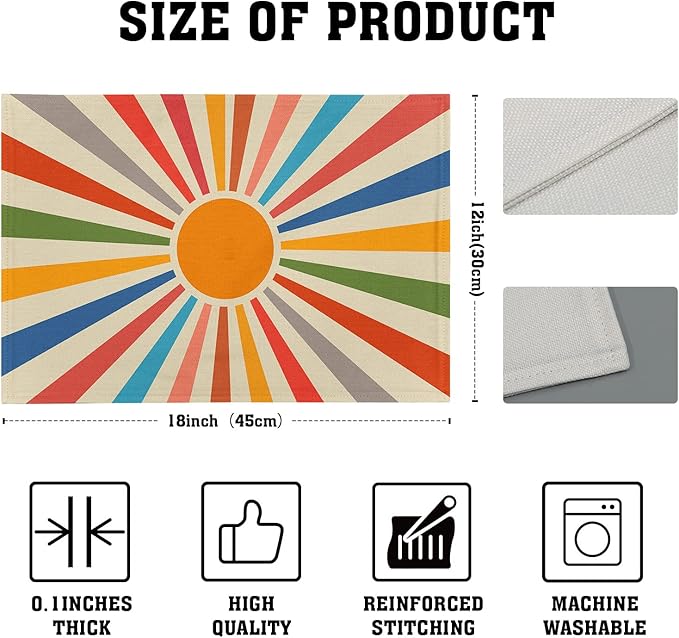 Colorful Boho Placemats Set of 6 Rustic Retro Rainbow 70s Sun Linen Washable Kitchen Dining Table Mats Stain Heat-Resistant Desktop Decor Place Mats for Home Party Indoor 12x18 in