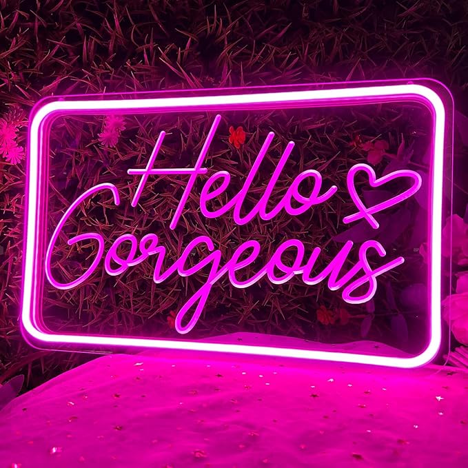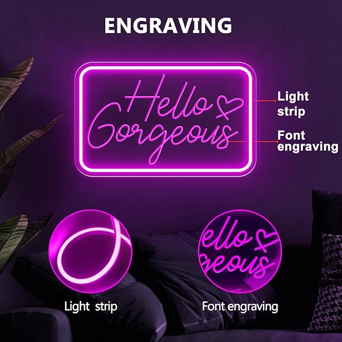 - 🌸【Exquisite 3D Art Carving Design】: Experience the epitome of elegance with our neon lights featuring a breathtaking 3D art carving design. Crafted with precision using silicone light strips and acrylic backplates, the "Hello Gorgeous" message is intricately engraved on crystal-clear acrylic. Enhanced by surrounding pink LED neon strip lighting, the 3D engraved letters come to life, radiating vibrant colors throughout the space.