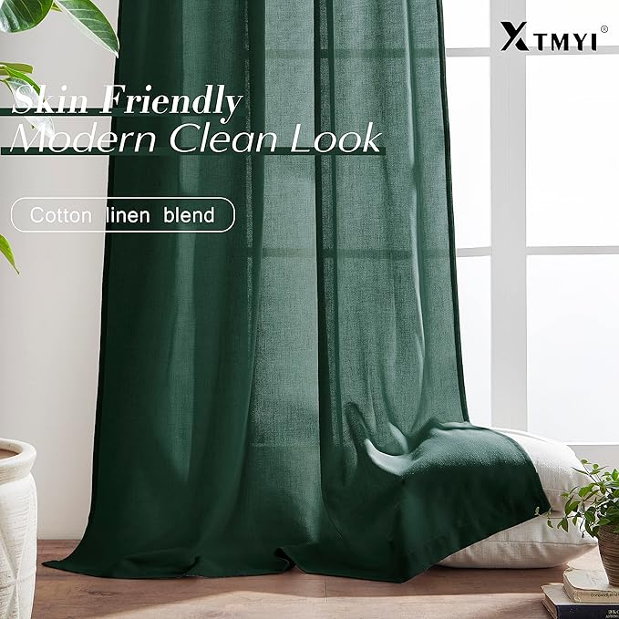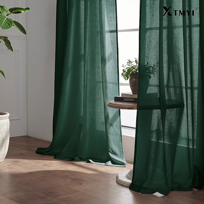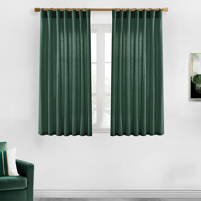 XTMYI Emerald Dark Green Back Tab/Hook Belt Linen Cotton Sheer Curtains for Bathroom 45 Inch Length