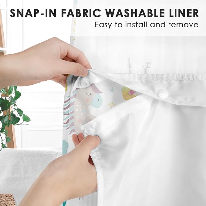 Unicorns Rainbow Cute No Hook Shower Curtain with Snap in Liner, Cloud Fun Girl Kids Colorful Bath Curtain with Double Layers Waterproof Fabric and Mesh Top Window 71x74 Inch