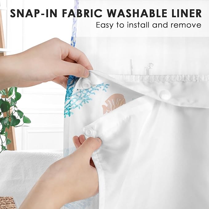 Mermaid Glitter No Hook Shower Curtain with Snap in Liner, Coral Starfish Seashell Underwater Bath Curtain with Double Layers Waterproof Fabric and Mesh Top Window 71x74 Inch