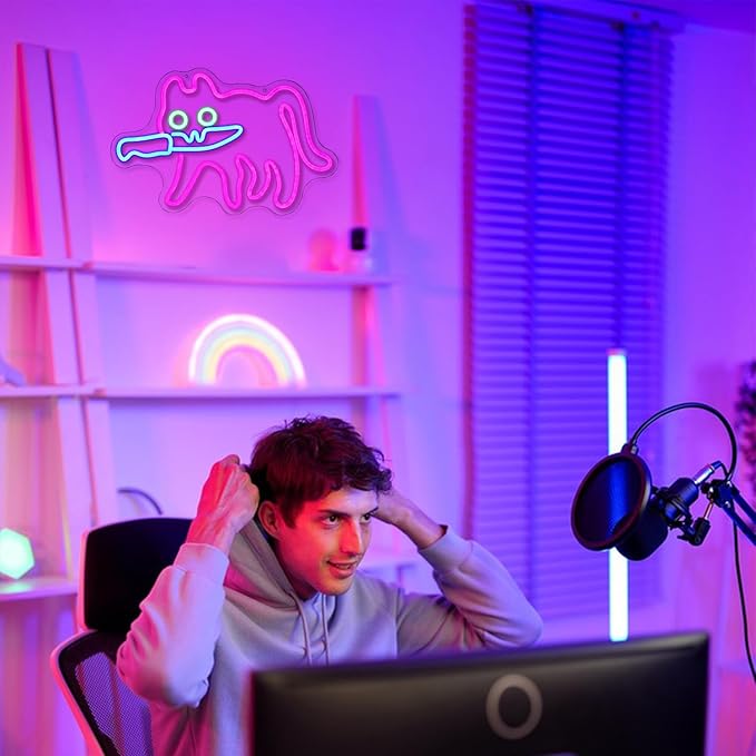 - Eye-catching Cat Decor:Sneaky cat neon lights are designed in the style of cats, and a pink cat with green eyes is holding a deep blue knife in its mouth.Cute neon signs can be used as decorations to add charm to your space.