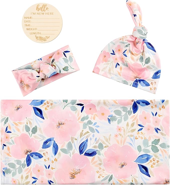 Baby Receiving Blanket Swaddle Blanket Infant Wrap with Matching Headband Beanie and Name Card (Pink and Purple)