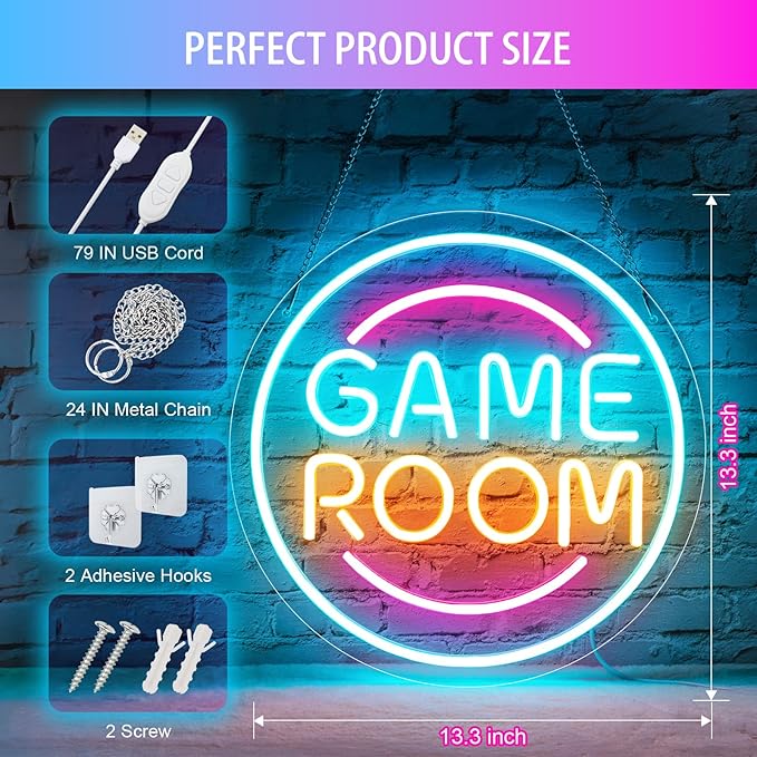 - 🗒️【PRODUCT LIST AND NOTE】Product List: 1pcs*neon gamer signs for boys room + 1pcs*metal chain + 2pcs*strong hooks + 2pcs expansion screws. When using strong hooks, please pay attention to: 1. Ensure that the wall is smooth, tidy, and free of dust; 2. stick the hook onto the wall and wait for 4-8 hours before using it (to prevent falling), If you want it to never falling, please choose expansion screws for fixation.