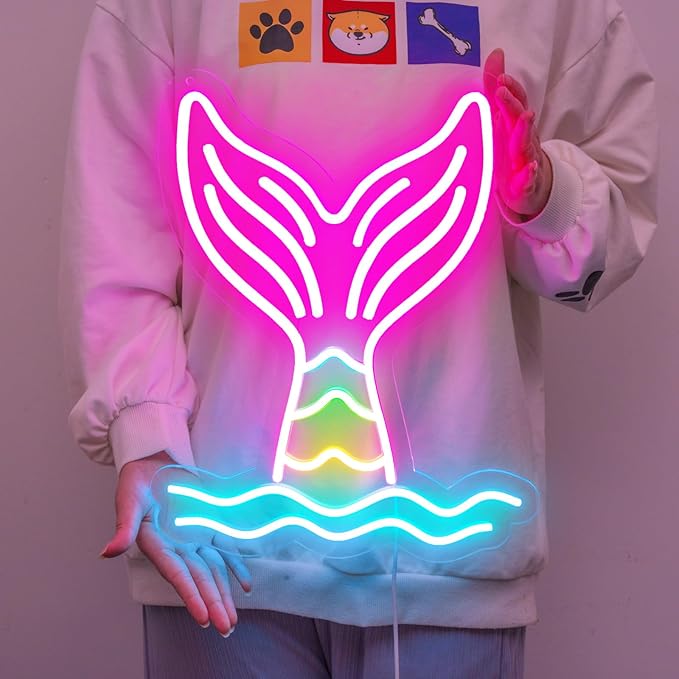 - 🎁【VERSATILE DECOR AND GIFT】Cute led mermaid tail neon light can be used in various environments, mermaid lamp for grils room, living room, hotels decor, game room, cafe shops and home decor. mermaid tail lamp also an artistic sign for activities such as Christmas, banquets, wedding birthdays party and New Year. You can also give mermaid led lights for girls room as a gift to your grils, friends