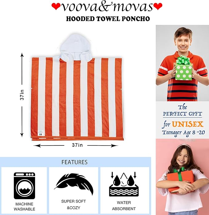 VOOVA & MOVAS Hooded Bath Towel for Big Kids | Large (8-16Years) Thick and Absorbent Cotton Poncho Towel Robe for Pool, Swim, and Bath - Red and White Cabana