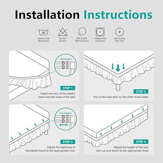 - Easy Installation: Equipped with adjustable elastic and white buckles, this bed skirt fits securely around your bed. It's suitable for beds with a 15-inch drop. Simply wrap it around your mattress and adjust the buckles for a snug fit.