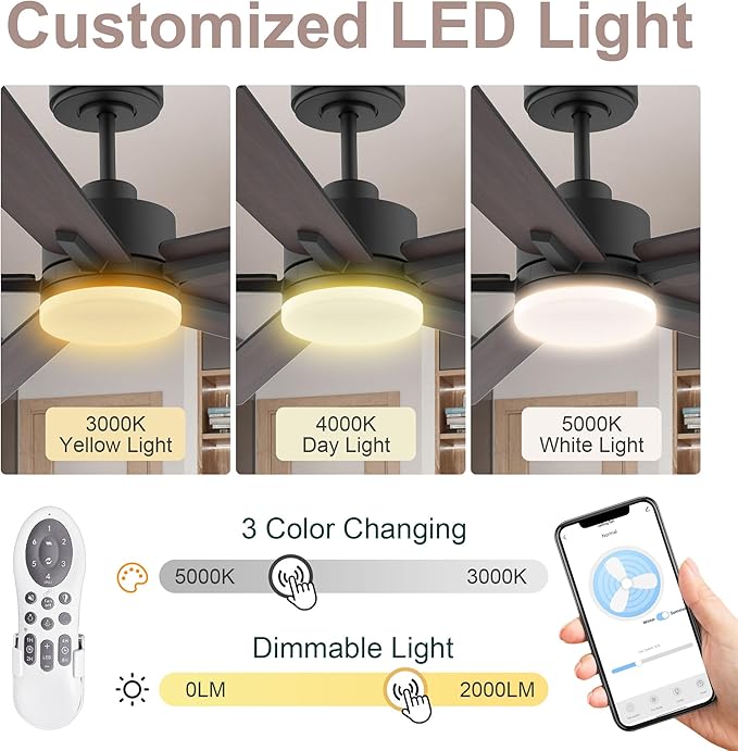 - 【Dimmable LED Lights & Color-changing】Lorpies ceiling fan with 3 light modes (3000K warm yellow light, 4000K bright daylight, 5000K cool white light), switching mood on the remote control easily for relaxation, work, or entertainment. The black smart ceiling fan is dimmable and color-changing from 0-100 percentage to create the desired atmosphere for working, leisure, or parties. Bright 2000 lumen ceiling fan light worked with alexa offers better eye protection and a longer lifespan.