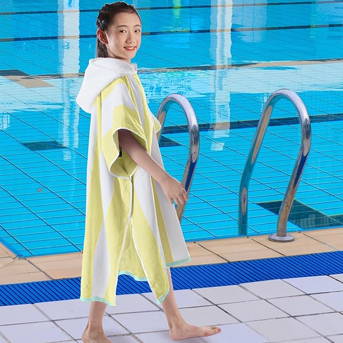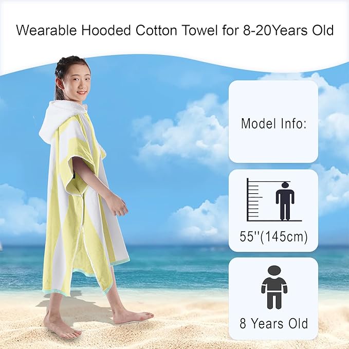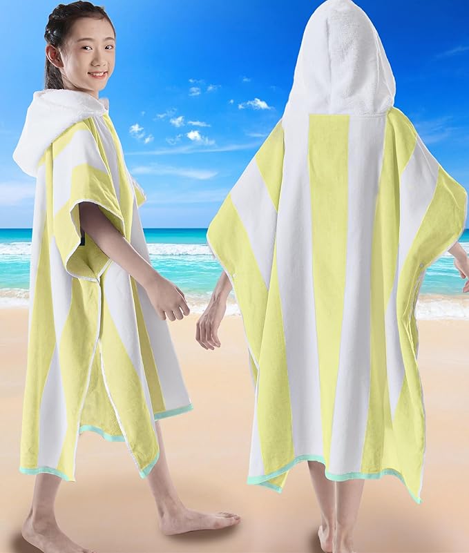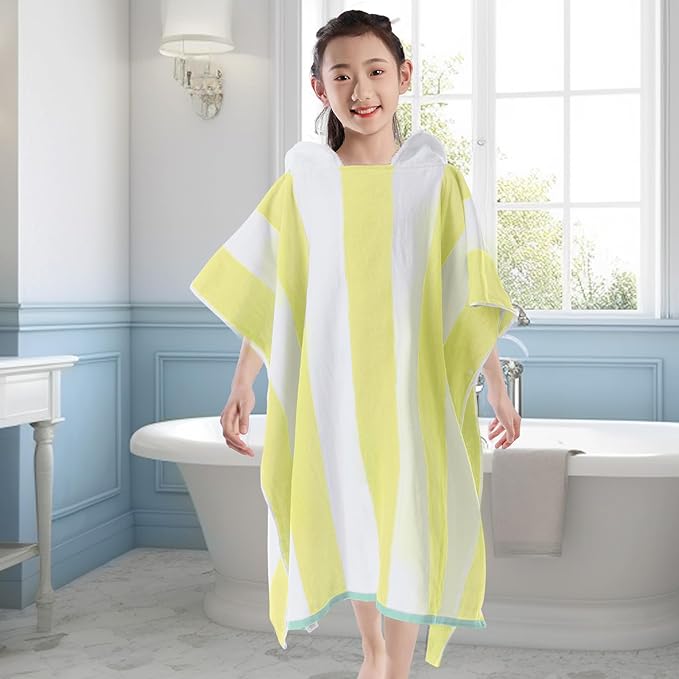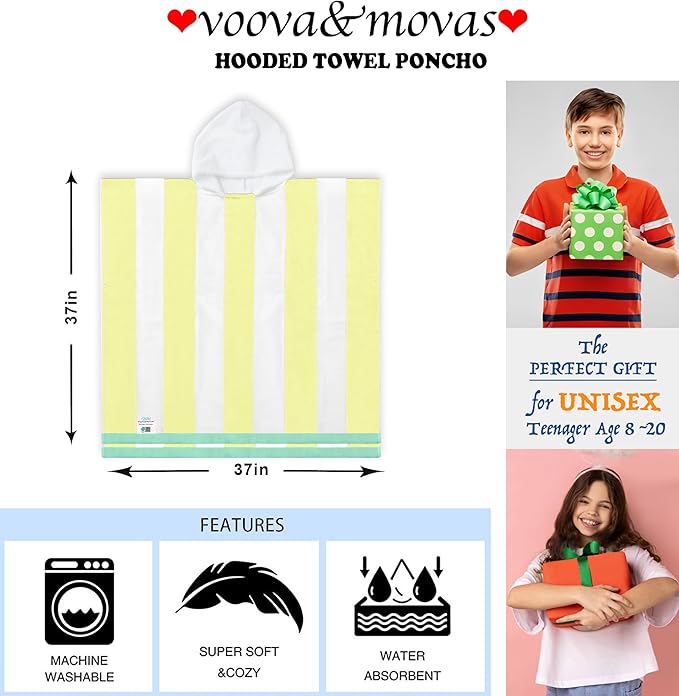 VOOVA & MOVAS Big Kids Hooded Towel Poncho | Large, Soft, Absorbent Cotton Towel Robe | 8-16Years | Versatile for Pool, Swim,Beach and Bathroom | Yellow Cabana Stripe