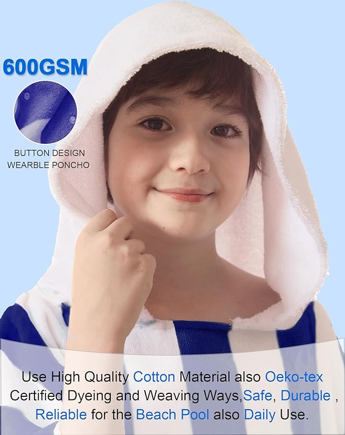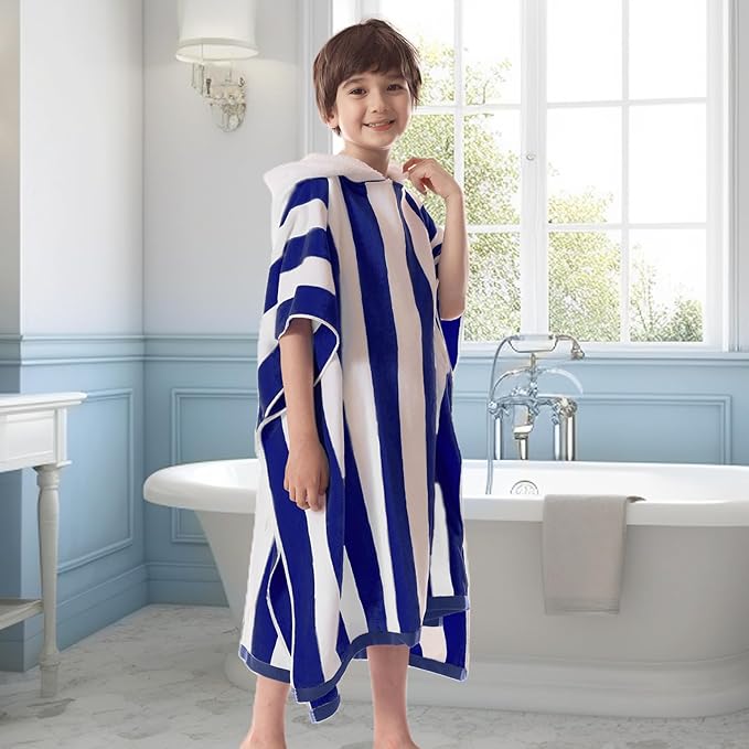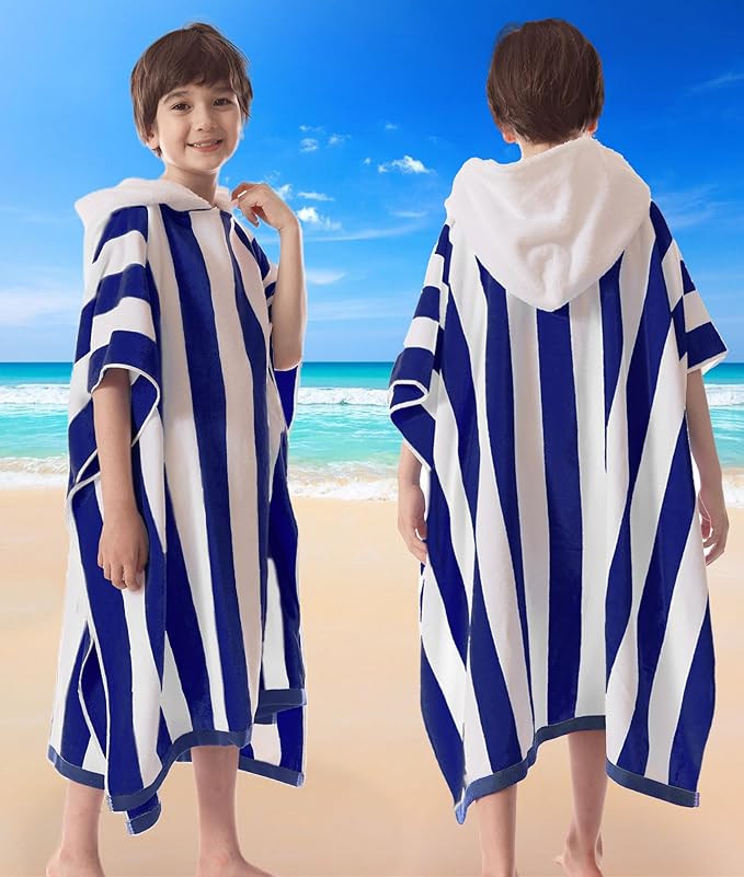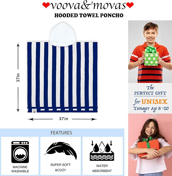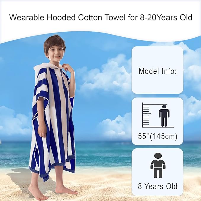 VOOVA & MOVAS Big Kids Hooded Towel Poncho | 8-16Years | Large, Soft, Absorbent Cotton Towel Robe | Versatile for Pool, Swim,Beach and Bathroom | Gem Blue Cabana Stripe