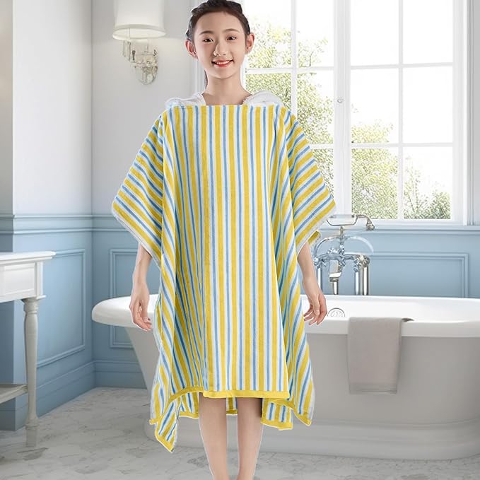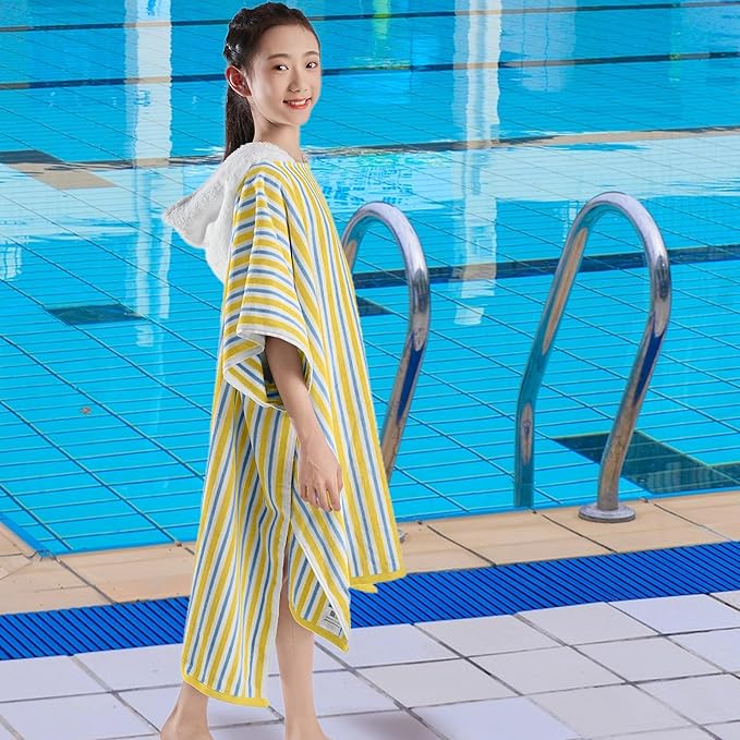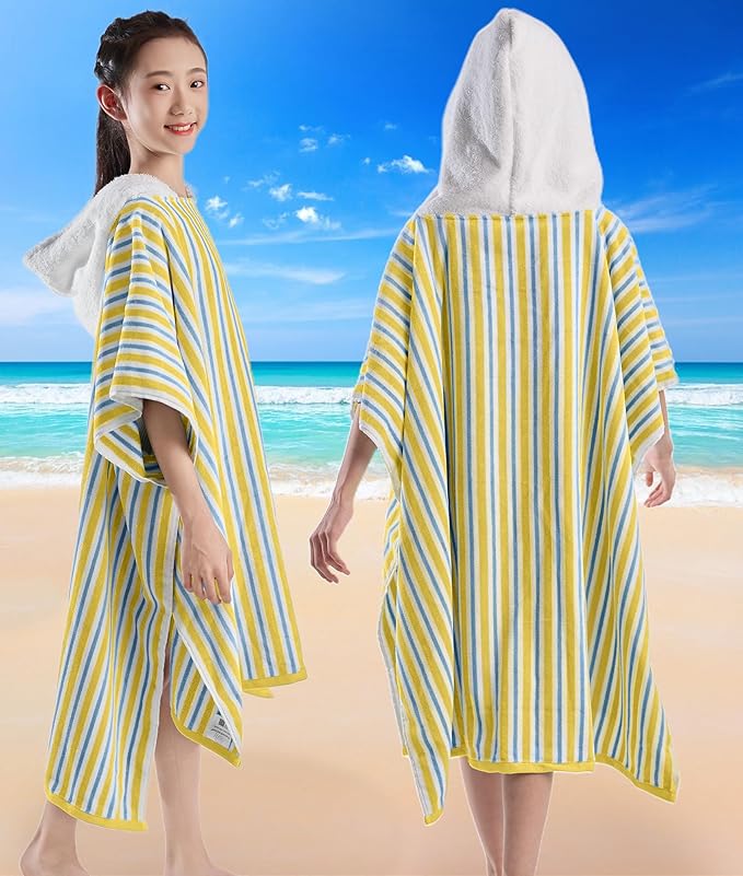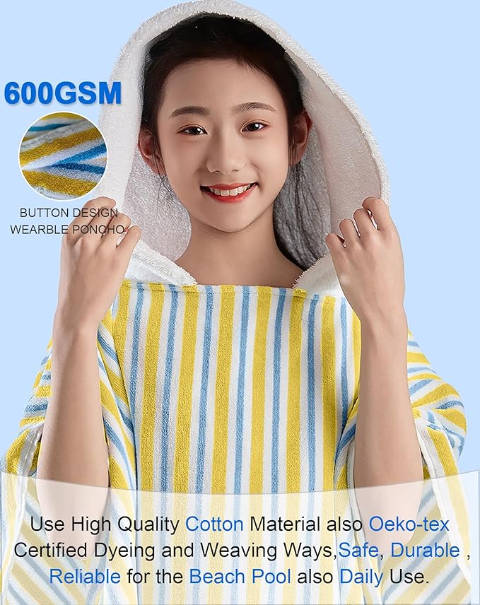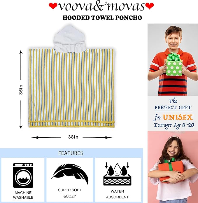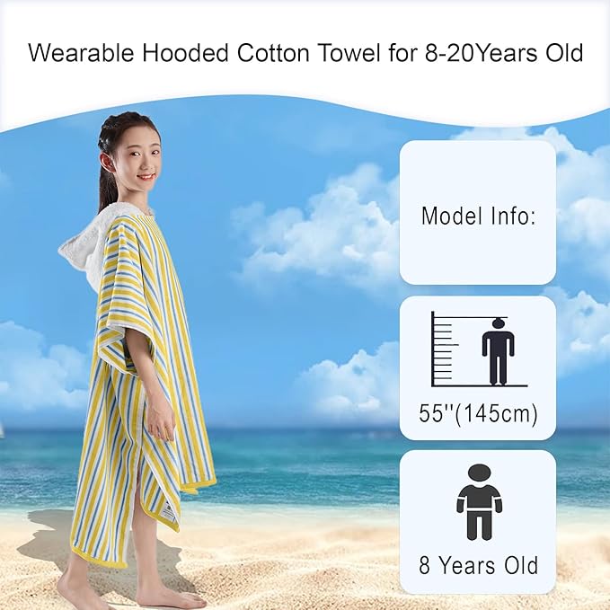 VOOVA & MOVAS Teens Beach Towels with Hood (8-16Years), Large Soft and Absorbent Cotton Hooded Pool Towel Poncho Robe - Versatile for Pool, Swim, and Bath, Blue Yellow Stripe