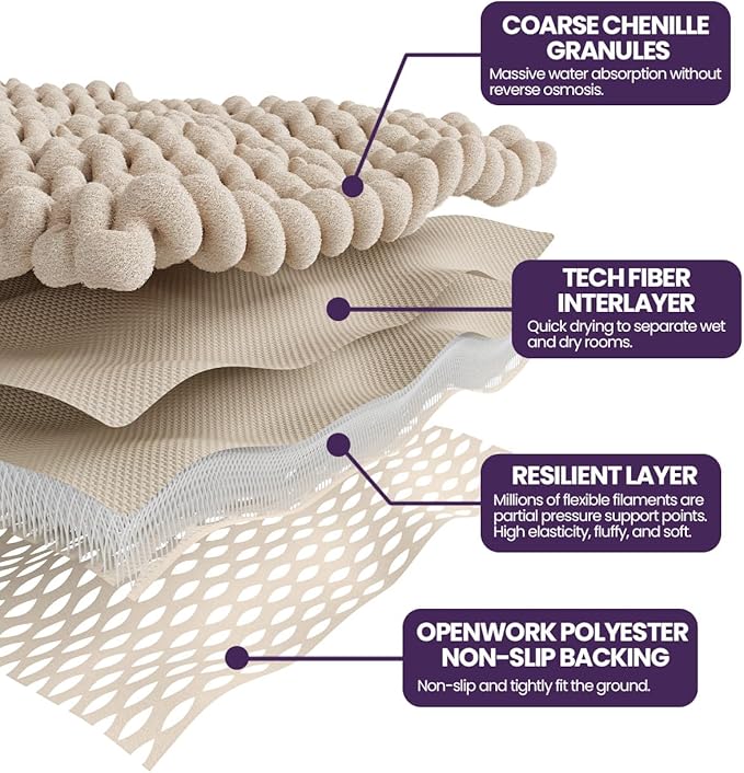 - Absorbent and Quick Dry: The mat’s fiber features advanced absorbent technology, which quickly and efficiently traps excess water from baths, showers, and sinks. This not only protects your floors from water drips but also keeps your feet dry in no time
