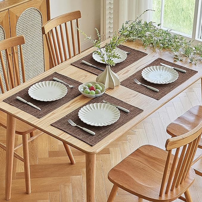 Softalker Faux Linen Placemats Set of 6-12 x 18 Inch, Heat Resistant Double Layered Durable Burlap Farmhouse Place Mats, Non-Slip Washable Rustic Table Mats for Dining, Kitchen, Party(Dark Brown