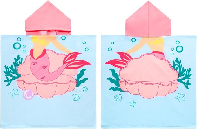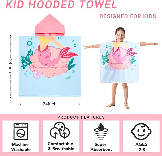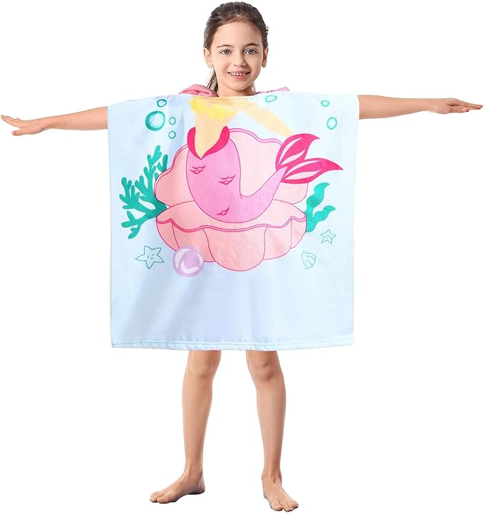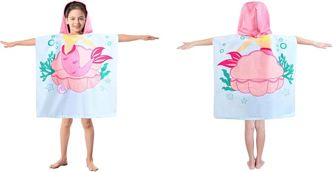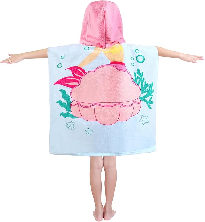 Kids Blue Mermaid Hooded Beach Towel Girls Cute Poncho Pool Towels with Hood 24*47 in Soft Microfiber Swim Cover-ups Kids Ages 3-10 Thick Absorbent Cotton Hooded Bath Towel Wrap Bathrobe